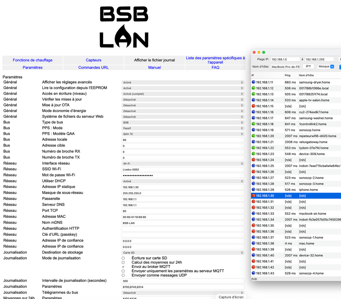 J’arrive à me connecter en local au BSB-lan via l’interface web. Mais il faut absolument que je me connecte au wifi du BSB-lan avant.
