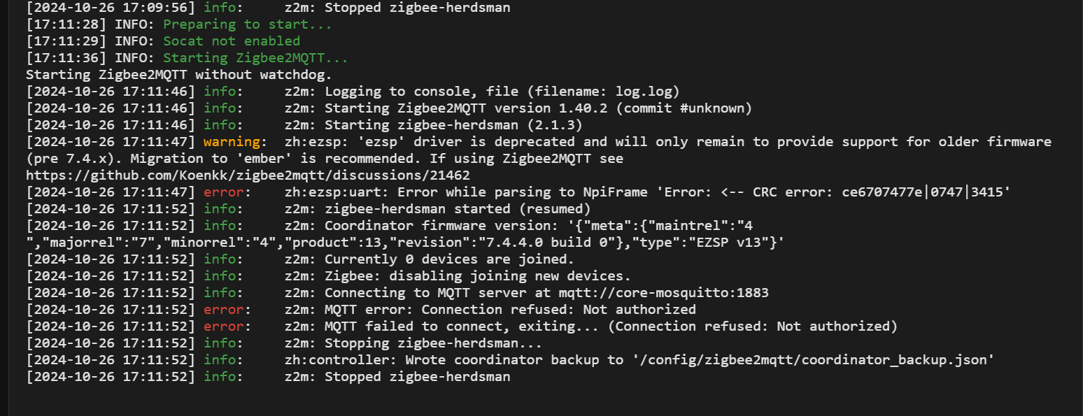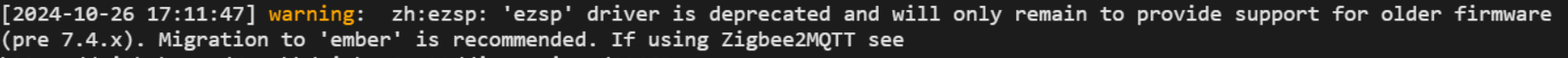 come tu peux le voir aussi tu as une une erreur qui t’indique que le driver ezsp est déprécié
