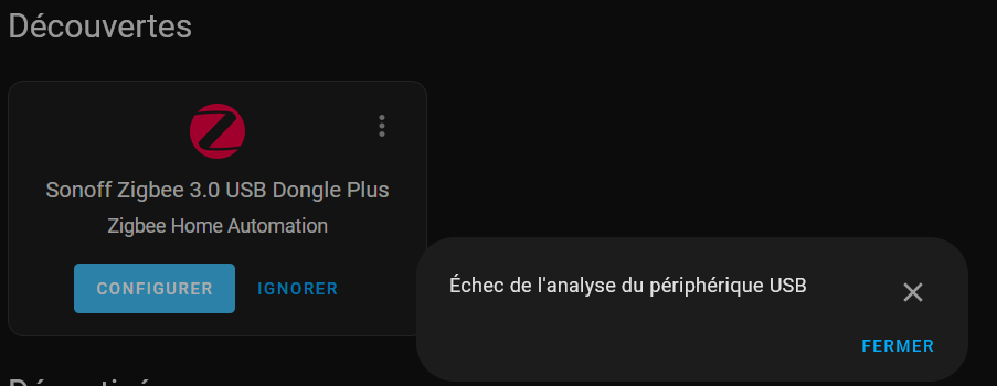 Alors oui quand HA découvre la nouvelle clé je suppose que tu n’en n’as qu’une ? donc elle est déja utilisée par Z2M. donc tu ignore ce que HA vient de découvir