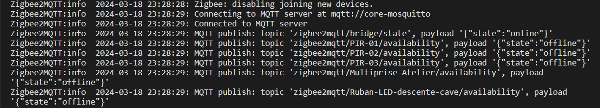 prochaine étape, il faut s’assurer que ces informations sont bien remontée vers le broker MQTT. peux tu vérifier que l’addon mosquitto est en fonctionnement et regarde aussi dans les logs, tu ne verras pas d’informations des capteurs mais on pourra voir si Z2M et HA s’y connectent.