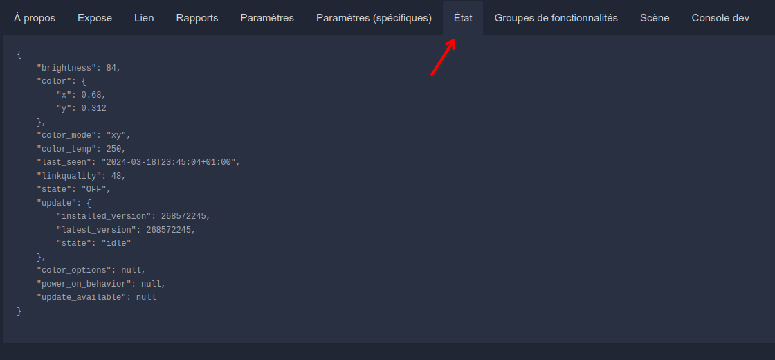 Donc Z2M fonctionne et récupères des informations. j’aurais aimé voir un « last seen » mais c’est pas grave on va imaginer que les informations sont récentes puisque tu as redémarré Z2M et on a vu des infos passer dans le log.