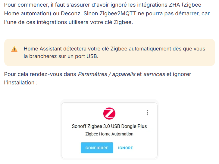 as tu ignoré l’installation de ZHA (zigbee home automation) dans paramètres / appareil et service ?
