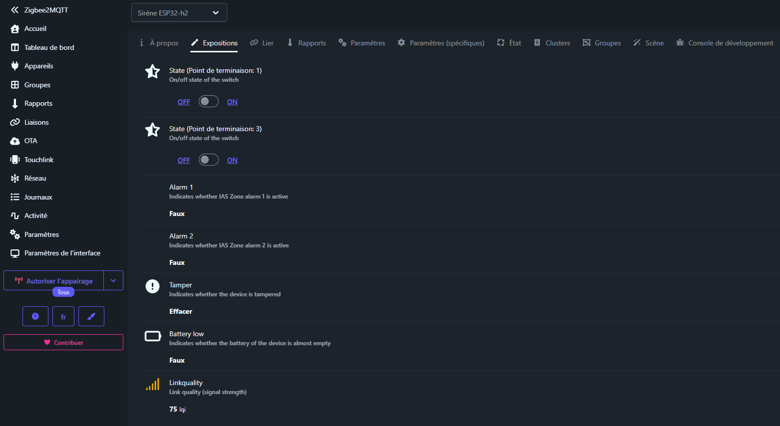 Contact Switch(Endpoint 2) comme capteur de sécurité. - Actions : Liez l’état « Armed » d’Alarmo à l’Endpoint 3 de la sirène pour le retour visuel.