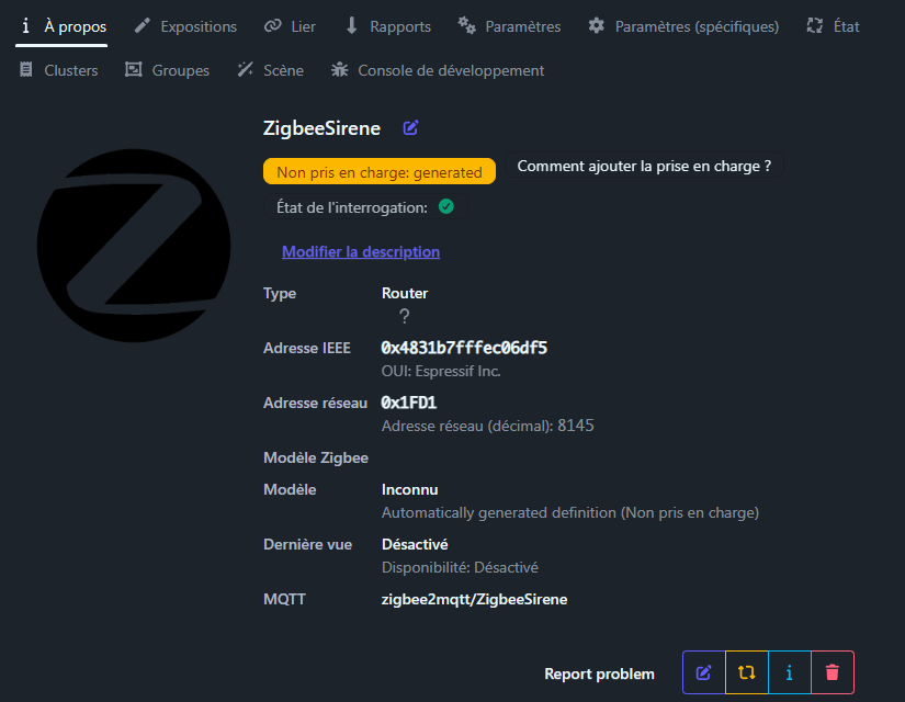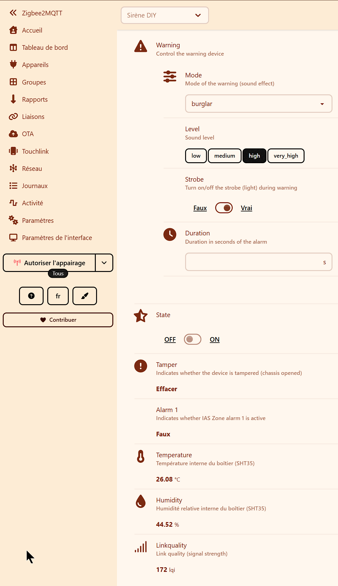 2. Zigbee2MQTT / ZHA : L’appareil est reconnu immédiatement. Il est conseillé de le renommer « Sirène Alarme » pour faciliter l’intégration. Vous pouvez modifier les définitions de chaque composant pour rendre le projet plus pratique. le contact temper ce fait sur alarm 1 et alarm 2 en même temps.