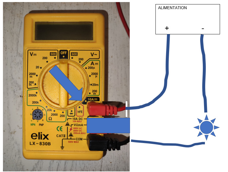 pour mesurer le courant je doit régler comment sur le multimètre et ou connecter les cosses ?