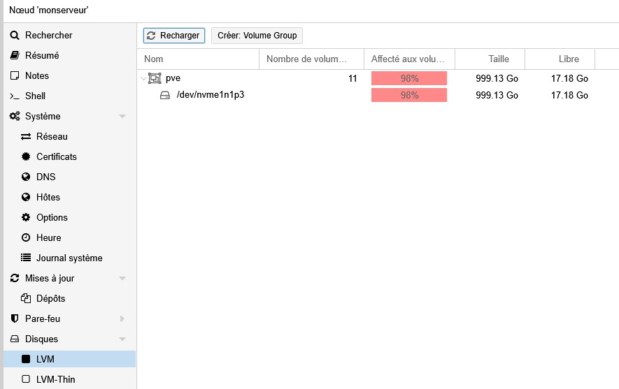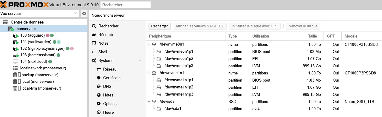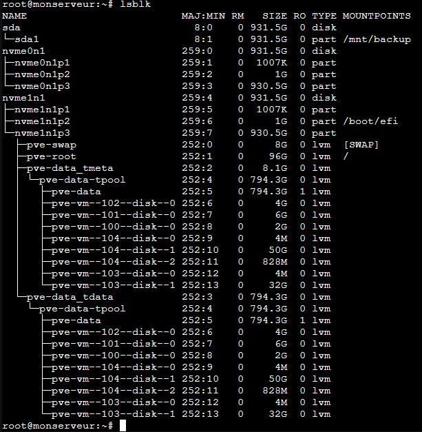 Mais effectivement nvme0 semble avoir été partitionné comme un disque d’installation de Proxmox aussi. Donc là il faudrait comprendre l’historique de l’installation…