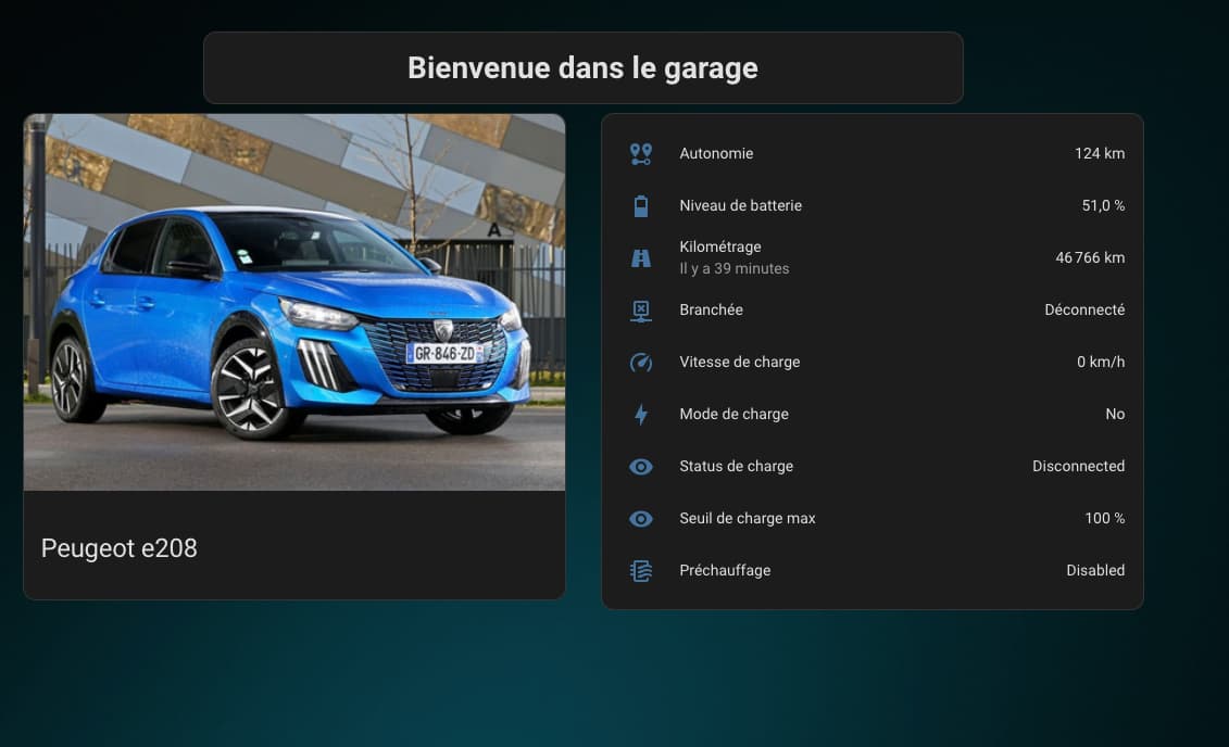 Hello, après plusieurs mois j’ai enfin trouvé le temps d’installer une intégration pour mon véhicule hybride (308 SW), j’ai choisi l’intégration citée plus haut par @Patrick44fr , ben ça marche nickel du 1er coup, impressionnant la qté d’infos qui remontent !