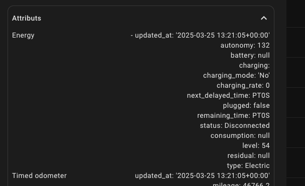 Par contre sur certains sensors les informations ne remontent pas correctement et pas à jour, le kilométrage est incorrect, la T°C extérieure ne change pas non plus, et ce même en relançant les entités.
