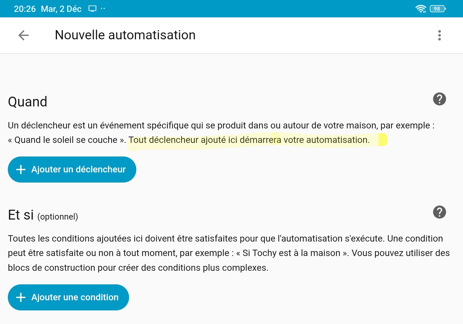 déclencheur: les éléments qui vont lancer l’automatisation. N’importe lequel des déclencheurs va lancer l’automatisation (c’est un OU), mais à l’inverse, si aucun déclencheur n’est présent, l’automatisation ne se lancera jamais.