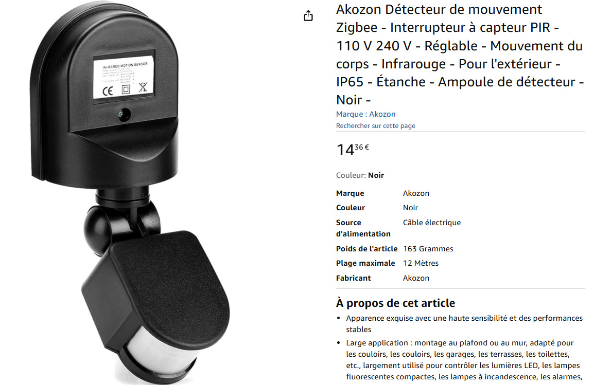 J’aimerais trouver des détecteurs de mouvement adapté a l’extérieur, IP65 (je crois).