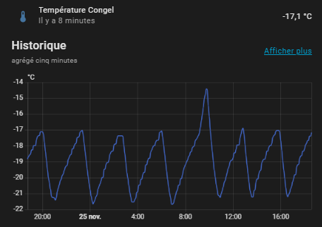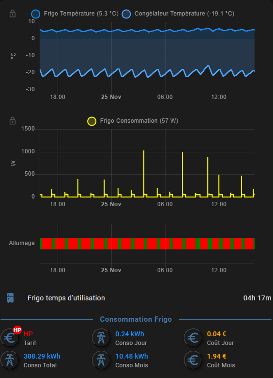 j’ai préféré mettre une sonde de température et l’automatisation qui va bien et mis la conso du réfrigérateur dans pertes et profit…