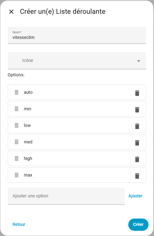 Pour commencer, il va falloir créer une “Entrée” de type Liste déroulante” et y ajouter tes 6 options :