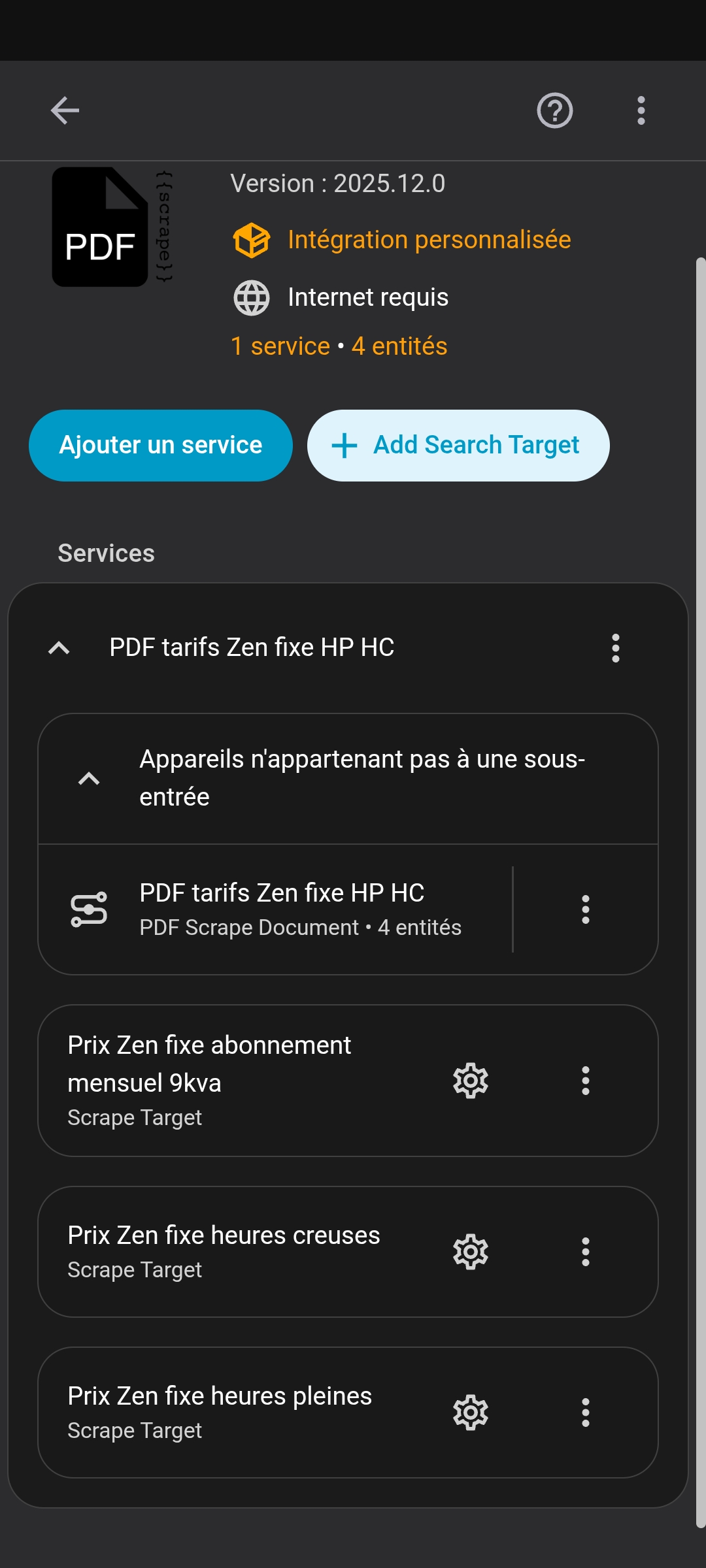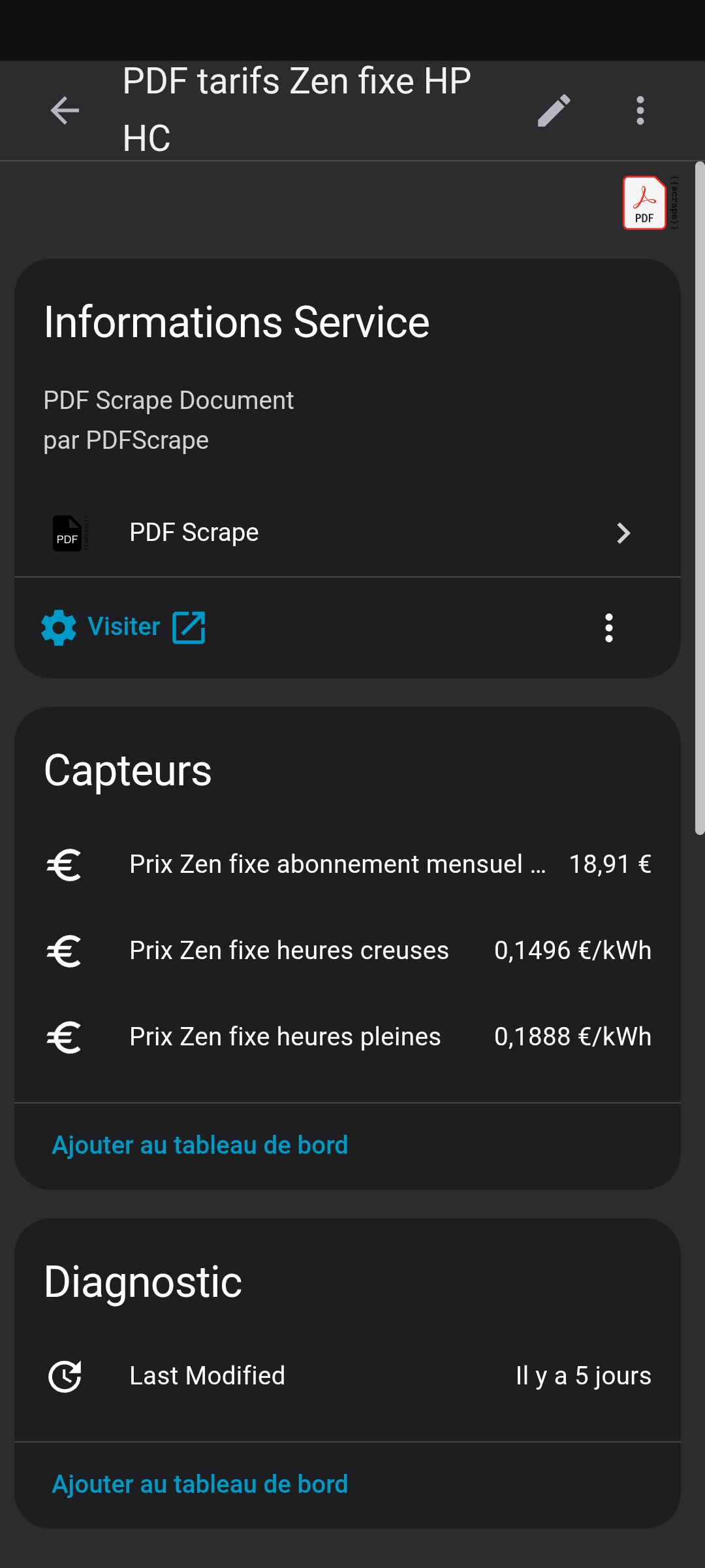 Comme promis je vous fais un retour après avoir testé l’intégration PDF scrape. Dans mon cas je n’ai plus tempo mais zen fixe HP HC, j’ai donc procédé à partir du PDF correspondant sur le site EDF.