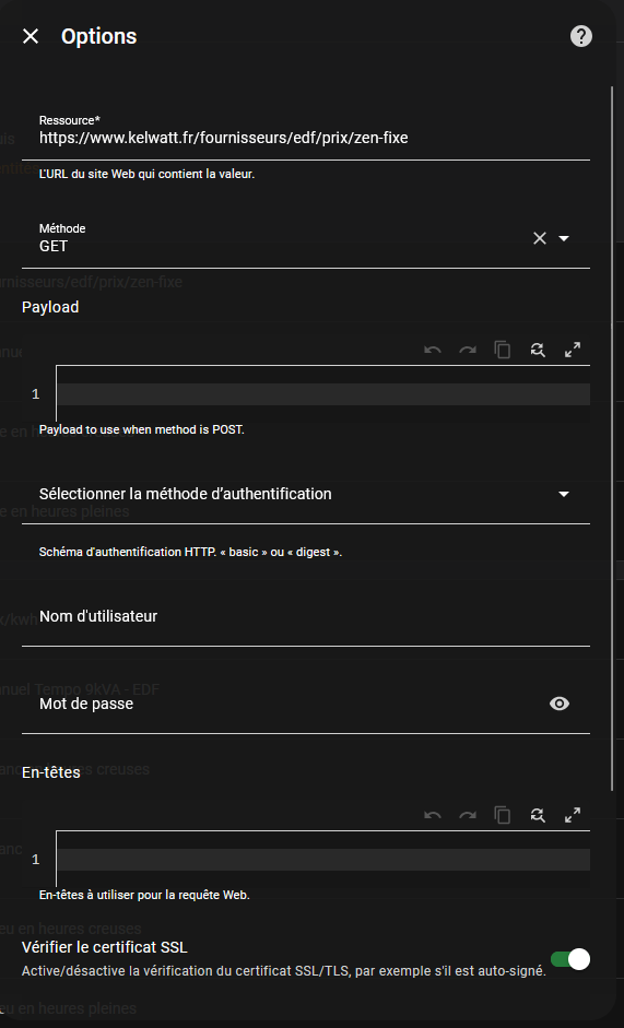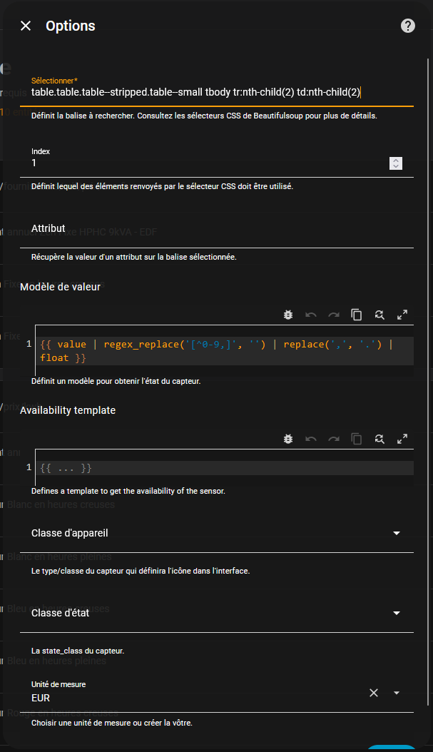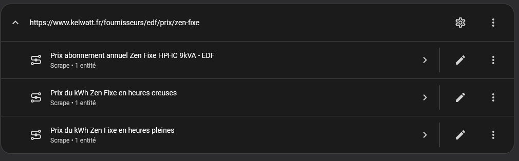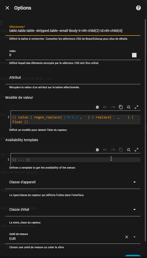 Finalement le python regex n’est pas nécessaire. Il suffit d’intégrer sur la page d’après les bonnes values, mais c’est effectivement bien plus complexe qu’avec scrape. Heureusement après quelques essais via l’intelligence artificielle Claude, j’ai finalement compris le principe et réussi à créer des capteurs correspondant exactement à l’abonnement mensuel et au prix du kilowatt-heure. Ça fonctionne. ![]()
