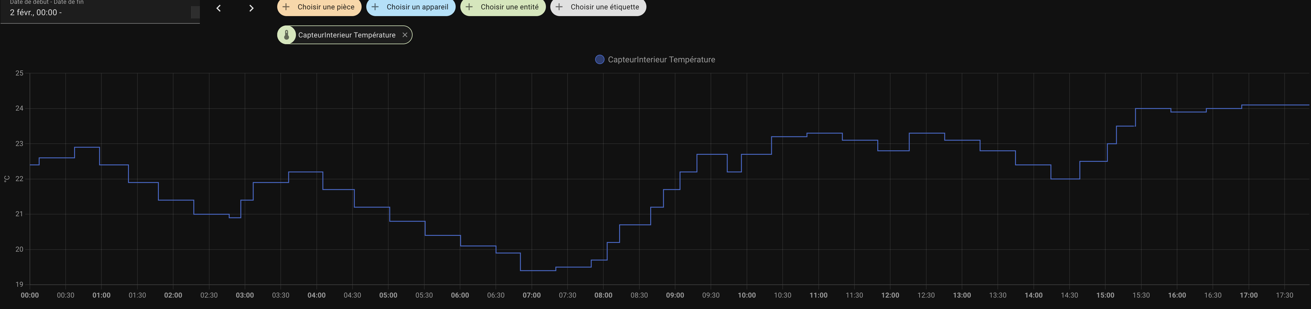 Là, si je regarde le graphique de ma sonde, il m’indique une moyenne de 19.7° sur quelques heures or la température d’aujourd’hui n’a pas dépassé les 6° dehors donc c’est impossible
