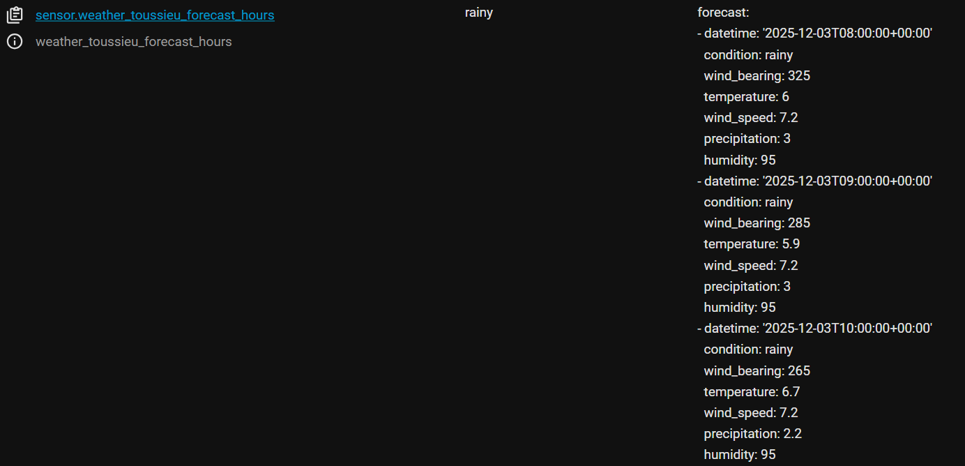 Ensuite, dans les attributs tu as les prévisions toutes les 3 heures.