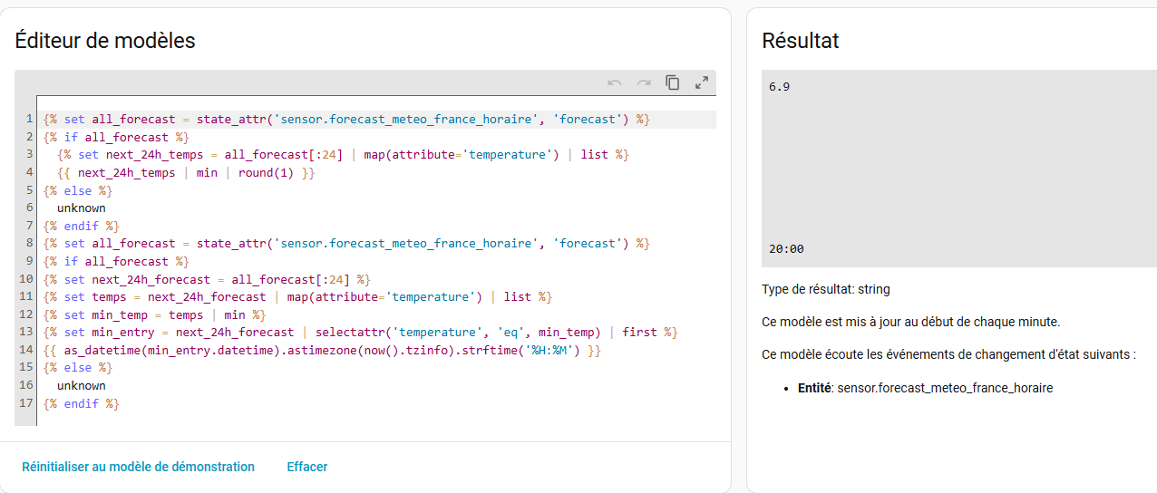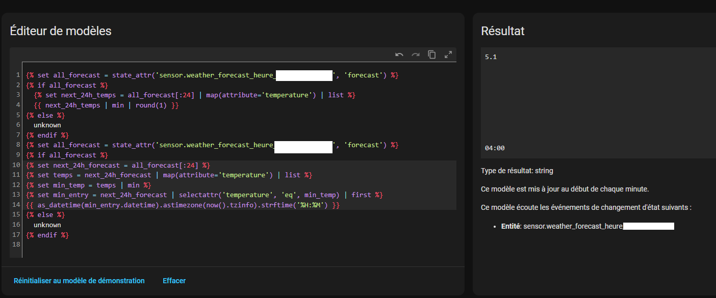 dans l’optique de l’hivernage de ma piscine, je cherche un moyen de récupérer l’heure de la température minimale prévue dans les 24 prochaines heures afin de m’en servir comme heure pivot dans le blueprint gestion de la filtration piscine avancé.