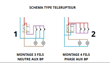 (les schémas ci-dessous sont pour des télérupteurs avec boutons poussoir au neutre)