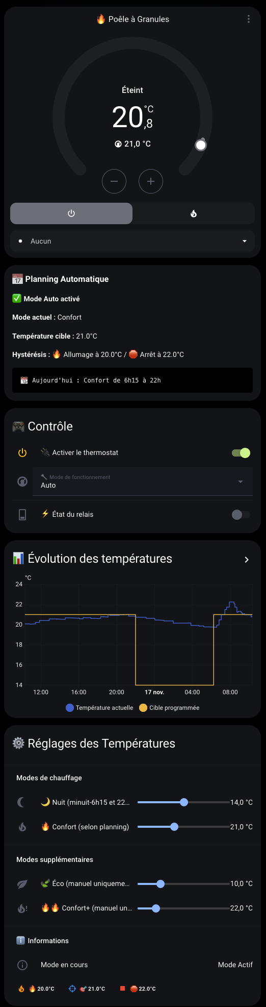 **Hystérésis :** 🔥 Allumage à {{ states('sensor.temperature_cible') | float - 1 }}°C / 🛑 Arrêt à {{ states('sensor.temperature_cible') | float + 1 }}°C