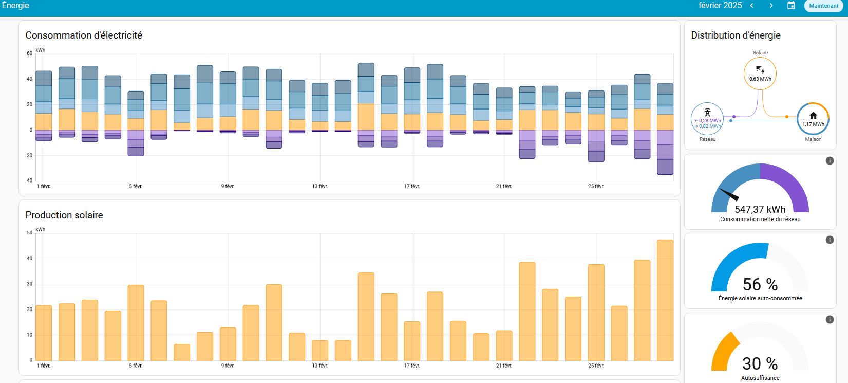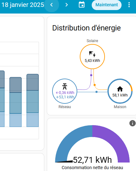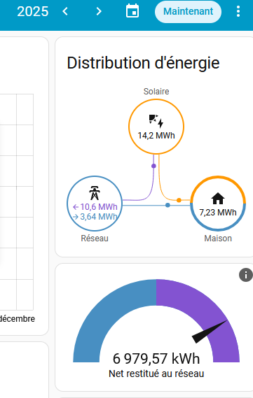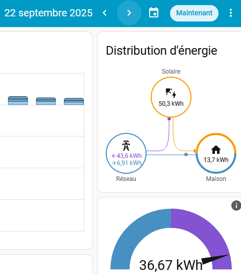 Visualiser les flux instantanés (réseau, solaire, maison, batterie) dans Power Flow Card Plus.