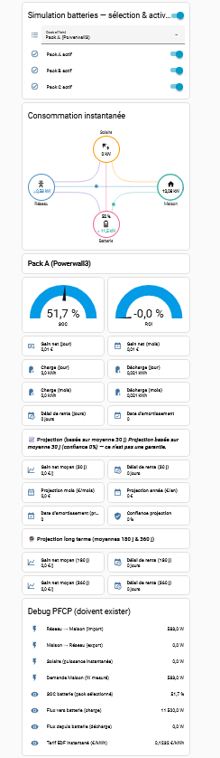Ce package Home Assistant permet de simuler trois batteries virtuelles indépendantes (Pack A/B/C) sur la base de tes mesures réelles (Linky + production solaire). L’objectif est de :