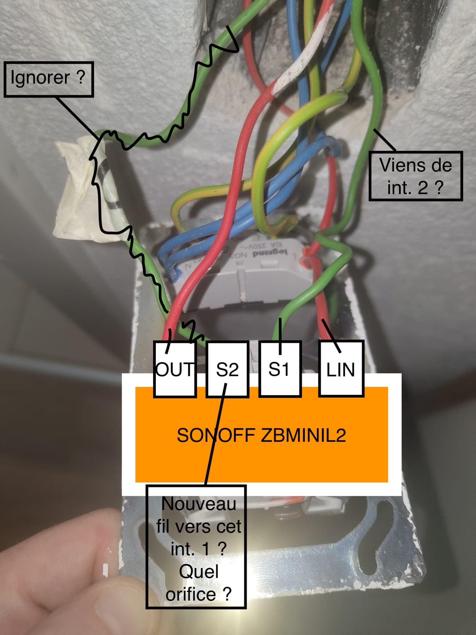 d) Si je n’ai pas besoin de modifier l’interrupteur 1 (ni le 2 s’il est aussi adaptable ?), j’imagine que je dois tout de même ajouter un bout de fil qui part de l’interrupteur 1 pour aller se planter dans le S1 (ouS2) du sonoff, mais dans quel orifice de l’interrupteur 1 dois-je le brancher ?