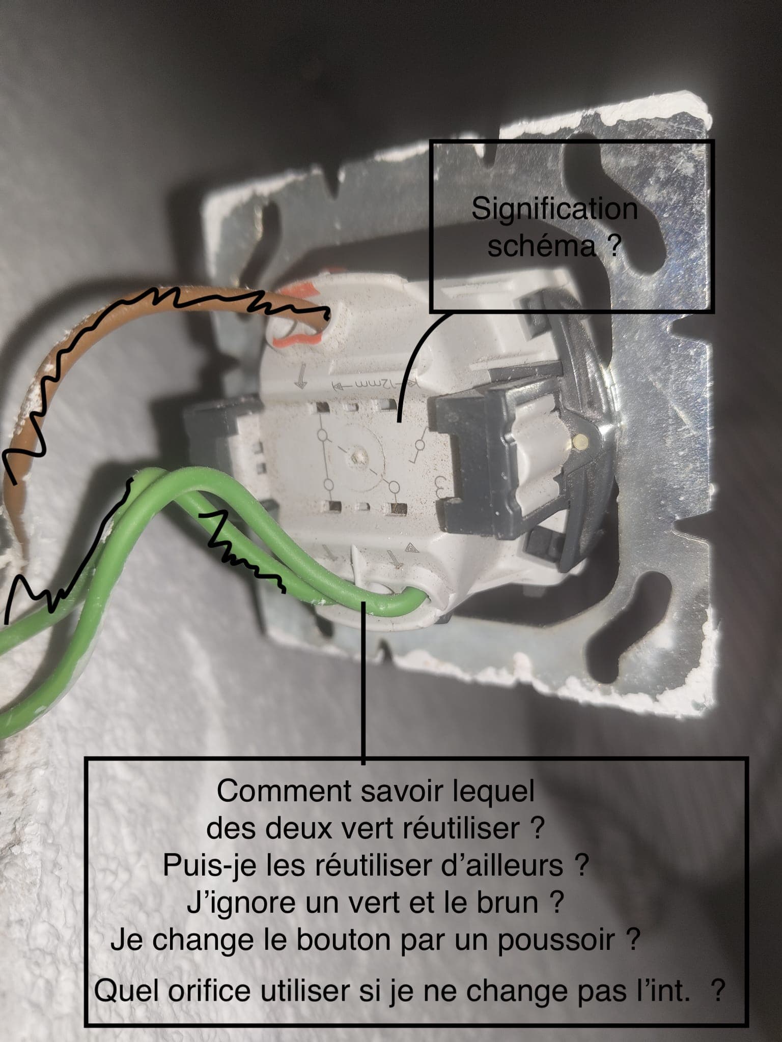 Ce sont surtout mes compétences en électricité qui posent soucis, j’ai pourtant essayé de me renseigner au mieux : entre va et vient, bouton poussoir, bascule etc. je m’y perd. Impossible de comprendre cette maudite installation ni même à quoi correspondent les différentes entrées sur mes interrupteurs avec certitude. J’ai bien vu qu’il y avait un schéma illustré sur ceux-ci, mais j’avoue ne pas tout comprendre et je ne trouve personne qui a des interrupteurs similaires aux miens.