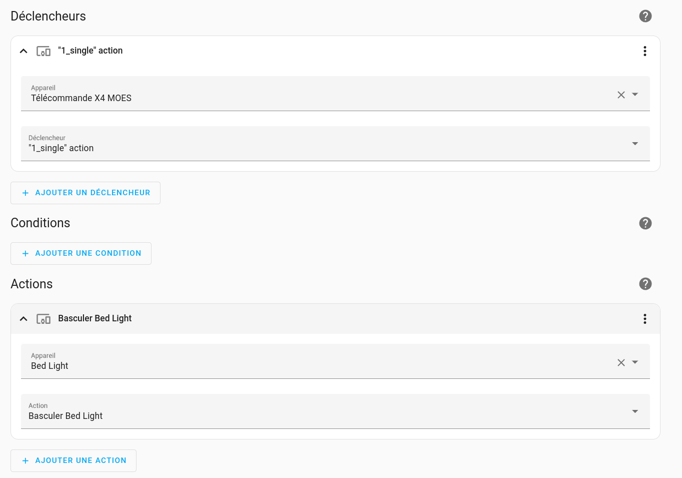 Puis dans votre Dashboard, créer une ampoule avec l’entité light.bed_light (par exemple) qui est une des entité virtuel créé automatiquement.