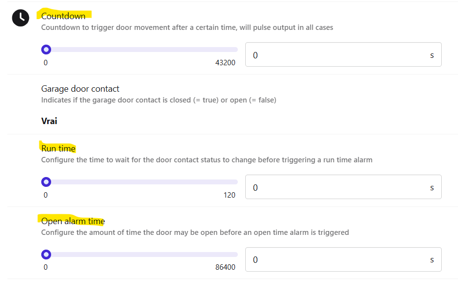 Runtime: Temps à attendre pour que le contact d’ouverture change d’état avant d’envoyer une alarme. Envoi une alarme si la porte mets plus de x secondes avant que le capteur d’ouverture passe de ouvert à fermé ou l’inverse. Typiquement ta porte met disons 15 secondes à s’ouvrir, tu mets 30s de run time. Si au bout de 30 seconde le capteur n’a pas changé d’état c’est que la porte est bloqué à mi chemin.