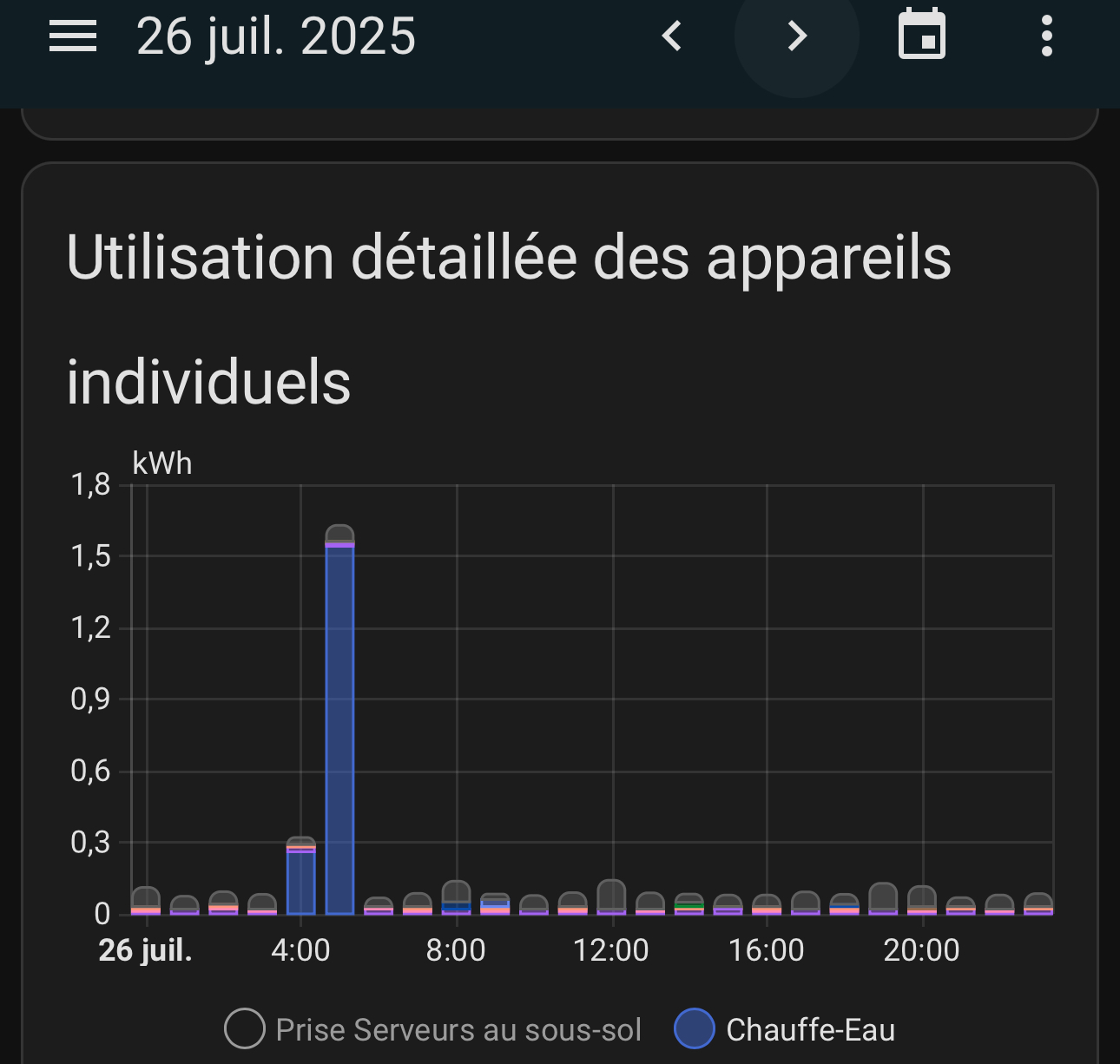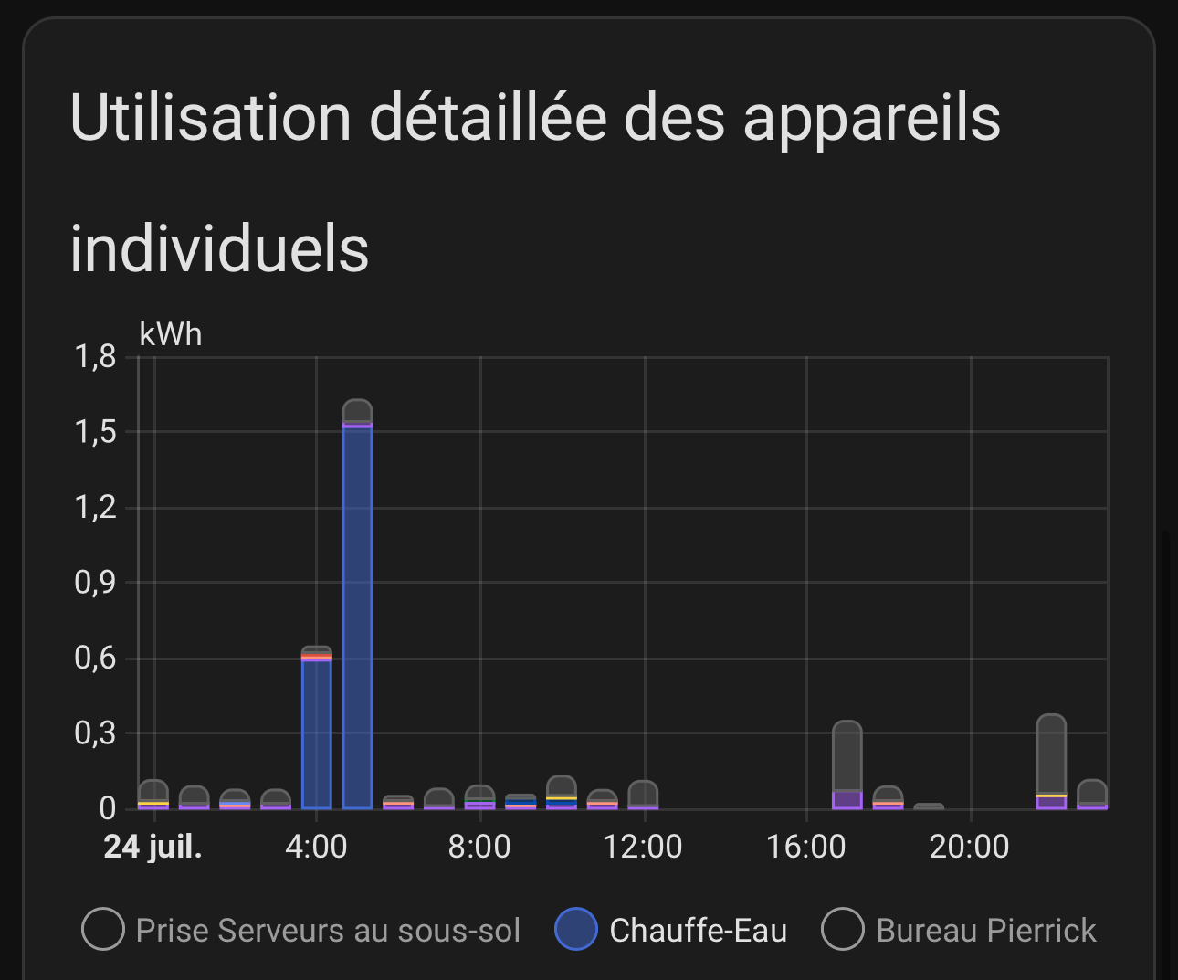 Pour ceux qui utilisent des panneaux photovoltaïques et ce chauffe-eau, j’ai trouvé la solution pour automatiser la production d’eau chaude en fonction de la prévision de production photovoltaique du lendemain. En gros, si la prévision de production est supérieur à tant et que la quantité d’eau chaude restante est supérieure à un %, alors mettre le chauffe en mode absence (sur une longue période sinon il chauffe quand-même), si la prévision de production est supérieur à tant et que la quantité d’eau chaude restante est inférieure à un % ou inconnue, alors régler la température de consigne sur 50°C histoire d’avoir de l’eau chaude le matin, si la prévision de production est inférieure à tant , régler la température de consigne sur 65°C car il n’y aura pas assez de production solaire en heures pleines. Ensuite faire des automatisations pour démarrer/arrêter le mode Boost en fonction de la production solaire, et une automatisation pour arrêter le mode absence le matin pour permettre de chauffer la journée avec les panneaux photovoltaiques.