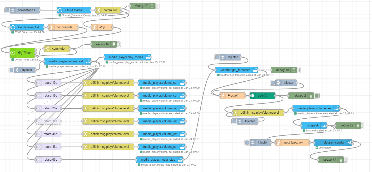 [{"id":"28c8ca471855464e","type":"tab","label":"Réveil PRENOM1 PRENOM2 ChatGPT","disabled":false,"info":"","env":[]},{"id":"9c8f096729b8c4a2","type":"chatgpt","z":"28c8ca471855464e","name":"openAI","topic":"__EMPTY__","BaseUrl":"https://api.openai.com","x":1240,"y":460,"wires":[["7b76deb4597ba1ab","20af4a0abdc80b9f"]]},{"id":"0393ca321cefeea8","type":"api-current-state","z":"28c8ca471855464e","name":"Heure réveil HA","server":"13f9fa40.d6bb86","version":3,"outputs":1,"halt_if":"","halt_if_type":"str","halt_if_compare":"is","entity_id":"input_datetime.heure_reveil","state_type":"str","blockInputOverrides":true,"outputProperties":[{"property":"payload","propertyType":"msg","value":"","valueType":"entityState"},{"property":"data","propertyType":"msg","value":"","valueType":"entity"}],"for":"0","forType":"num","forUnits":"minutes","override_topic":false,"state_location":"payload","override_payload":"msg","entity_location":"data","override_data":"msg","x":140,"y":140,"wires":[["54657566d681eef1"]]},{"id":"7dcb31e85bde8d57","type":"inject","z":"28c8ca471855464e","name":"","props":[{"p":"payload"},{"p":"topic","vt":"str"}],"repeat":"","crontab":"00 04 * * 1,2,4,5","once":false,"onceDelay":0.1,"topic":"","payload":"","payloadType":"date","x":130,"y":60,"wires":[["8aba6bba727d585a"]]},{"id":"54657566d681eef1","type":"function","z":"28c8ca471855464e","name":"on_override","func":"var time = msg.payload.slice(0, -3);\nmsg.payload = \"on_override \" + time;\nreturn msg;","outputs":1,"timeout":"","noerr":0,"initialize":"","finalize":"","libs":[],"x":310,"y":140,"wires":[["522f68d173c16b0c"]]},{"id":"e0fa9e7cdb04507c","type":"function","z":"28c8ca471855464e","name":"Prompt","func":"msg.payload = \"Pas d'émoji dans le message stp et donne les chiffres avec des virgules. La totalité de ton message doit faire moins de 40 secondes. Nous habitons dans une maison situé en France dans un petit village. Tu es le réveil de PRENOM1 8 ans et PRENOM2 2 ans, tu dois etre drôle. PRENOM1 doit s'abiller et prendre son petit déjeuner pour aller a l'école. PRENOM2 doit aller prendre son petit déjeuner avant d'aller chez NouNou Aurélie. Ensuite tu annonces la météo avec les données ci-dessous. Température prévu ce matin: \"+ msg.payload.today.templow +\", Température prévu cette après midi: \"+ msg.payload.today.temperature +\", Temps prévu pour aujourd'hui : \"+ msg.payload.today.condition\n\n\n\nmsg.topic = \"gpt-4o-mini\"\nmsg.max_tokens = \"500\"\nreturn msg;","outputs":1,"timeout":"","noerr":0,"initialize":"","finalize":"","libs":[],"x":1100,"y":460,"wires":[["9c8f096729b8c4a2"]]},{"id":"20af4a0abdc80b9f","type":"debug","z":"28c8ca471855464e","name":"debug 2","active":true,"tosidebar":true,"console":false,"tostatus":false,"complete":"payload","targetType":"msg","statusVal":"","statusType":"auto","x":1420,"y":460,"wires":[]},{"id":"ca76bd4d9809bf55","type":"api-call-service","z":"28c8ca471855464e","name":"","server":"13f9fa40.d6bb86","version":7,"debugenabled":false,"action":"media_player.play_media","floorId":[],"areaId":[],"deviceId":[],"entityId":["media_player.cuisine"],"labelId":[],"data":"{\t \"media_content_id\":\"media-source://media_source/local/Enzalla x Myst - Resonant Love.mp3\",\t \"media_content_type\":\"music\",\t \"announce\":\"false\"\t}","dataType":"jsonata","mergeContext":"","mustacheAltTags":false,"outputProperties":[],"queue":"none","blockInputOverrides":true,"domain":"media_player","service":"play_media","x":670,"y":1120,"wires":[[]]},{"id":"b35d90db3bc6e3a6","type":"api-call-service","z":"28c8ca471855464e","name":"","server":"13f9fa40.d6bb86","version":7,"debugenabled":false,"action":"media_player.volume_set","floorId":[],"areaId":[],"deviceId":["0919d728db1da7cb5385260b7adaa7cf"],"entityId":[],"labelId":[],"data":"{\t \"volume_level\":msg.playVolumeLevel\t}","dataType":"jsonata","mergeContext":"","mustacheAltTags":false,"outputProperties":[],"queue":"none","blockInputOverrides":true,"domain":"media_player","service":"volume_set","x":390,"y":1120,"wires":[["ca76bd4d9809bf55","b70718da9a988dc7","944a1e22f5d362f7","30653528ac1ef51c","730d2ae5d20b7d35","2971197b9339a9c2","041ba91c33fb1d9f","7df6d8bb5297f5c3"]]},{"id":"fd255afefad5385c","type":"inject","z":"28c8ca471855464e","name":"","props":[{"p":"playVolumeLevel","v":"0.1","vt":"num"}],"repeat":"","crontab":"","once":false,"onceDelay":0.1,"topic":"","x":150,"y":1120,"wires":[["b35d90db3bc6e3a6"]]},{"id":"b70718da9a988dc7","type":"delay","z":"28c8ca471855464e","name":"","pauseType":"delay","timeout":"10","timeoutUnits":"seconds","rate":"1","nbRateUnits":"1","rateUnits":"second","randomFirst":"1","randomLast":"5","randomUnits":"seconds","drop":false,"allowrate":false,"outputs":1,"x":640,"y":1200,"wires":[["a964dd2728b0e53f"]]},{"id":"b2241cf9f80ab8ae","type":"api-call-service","z":"28c8ca471855464e","name":"","server":"13f9fa40.d6bb86","version":7,"debugenabled":false,"action":"media_player.media_stop","floorId":[],"areaId":[],"deviceId":[],"entityId":["media_player.cuisine"],"labelId":[],"data":"","dataType":"jsonata","mergeContext":"","mustacheAltTags":false,"outputProperties":[],"queue":"none","blockInputOverrides":true,"domain":"media_player","service":"media_stop","x":1110,"y":1560,"wires":[[]]},{"id":"fa0f811e30843c88","type":"api-call-service","z":"28c8ca471855464e","name":"","server":"13f9fa40.d6bb86","version":7,"debugenabled":false,"action":"media_player.volume_set","floorId":[],"areaId":[],"deviceId":["0919d728db1da7cb5385260b7adaa7cf"],"entityId":[],"labelId":[],"data":"{\t \"volume_level\":msg.playVolumeLevel\t}","dataType":"jsonata","mergeContext":"","mustacheAltTags":false,"outputProperties":[],"queue":"none","blockInputOverrides":true,"domain":"media_player","service":"volume_set","x":1110,"y":1200,"wires":[[]]},{"id":"a964dd2728b0e53f","type":"change","z":"28c8ca471855464e","name":"","rules":[{"t":"set","p":"playVolumeLevel","pt":"msg","to":"0.15","tot":"num"}],"action":"","property":"","from":"","to":"","reg":