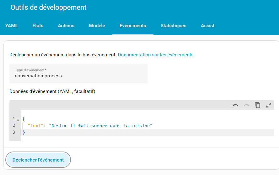 (tests faits sans micro, via Outils développeur → Événements) - Une automation filtre les phrases commençant par un mot-clé (