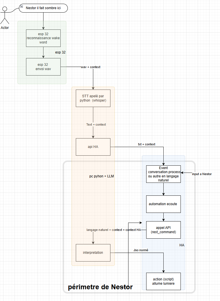 le REX se fait uniquement sur la parie encadré en gris, je ferais la partie « voix » plus tard, la ce qui m’intéresse c’est mettre en place un moteur de décision qui comprends un langage « humain » que ce soit le résultat d’un script, une saisie de texte, un speech to text …qui déclenche quelque chose de cadré (ou un refus) que je peux traiter via HA…