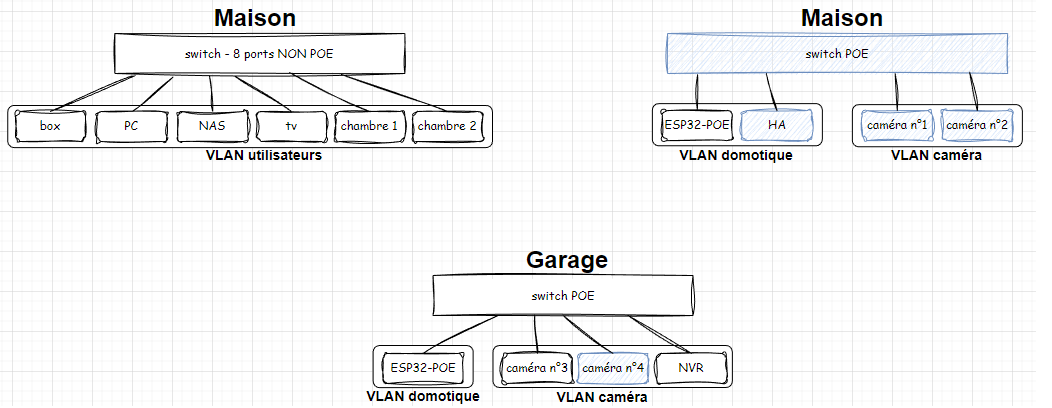 Usage (qui/quoi doit atteindre quoi) exemple je suppose que ton PC devra accéder au NVR et HA mais toujours par exemple est-ce que ton HA devra atteindre le NAS pour la sauvegarde …