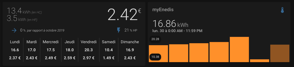hello @dertex , en effet, du fait que les données de la veille ne sont pas disponibles tout de suite, cela fait un décalage chaque matin, pour le moment, j’ai pas trop d’idée pour le gerer…sauf à mettre la valeur du yesterday à zéro entre 00h00 et le moment ou enedis donne l’info, mais top je trouve. Si tu as une idée, ou si ceux qui lisent en on une, je suis à l’écoute.