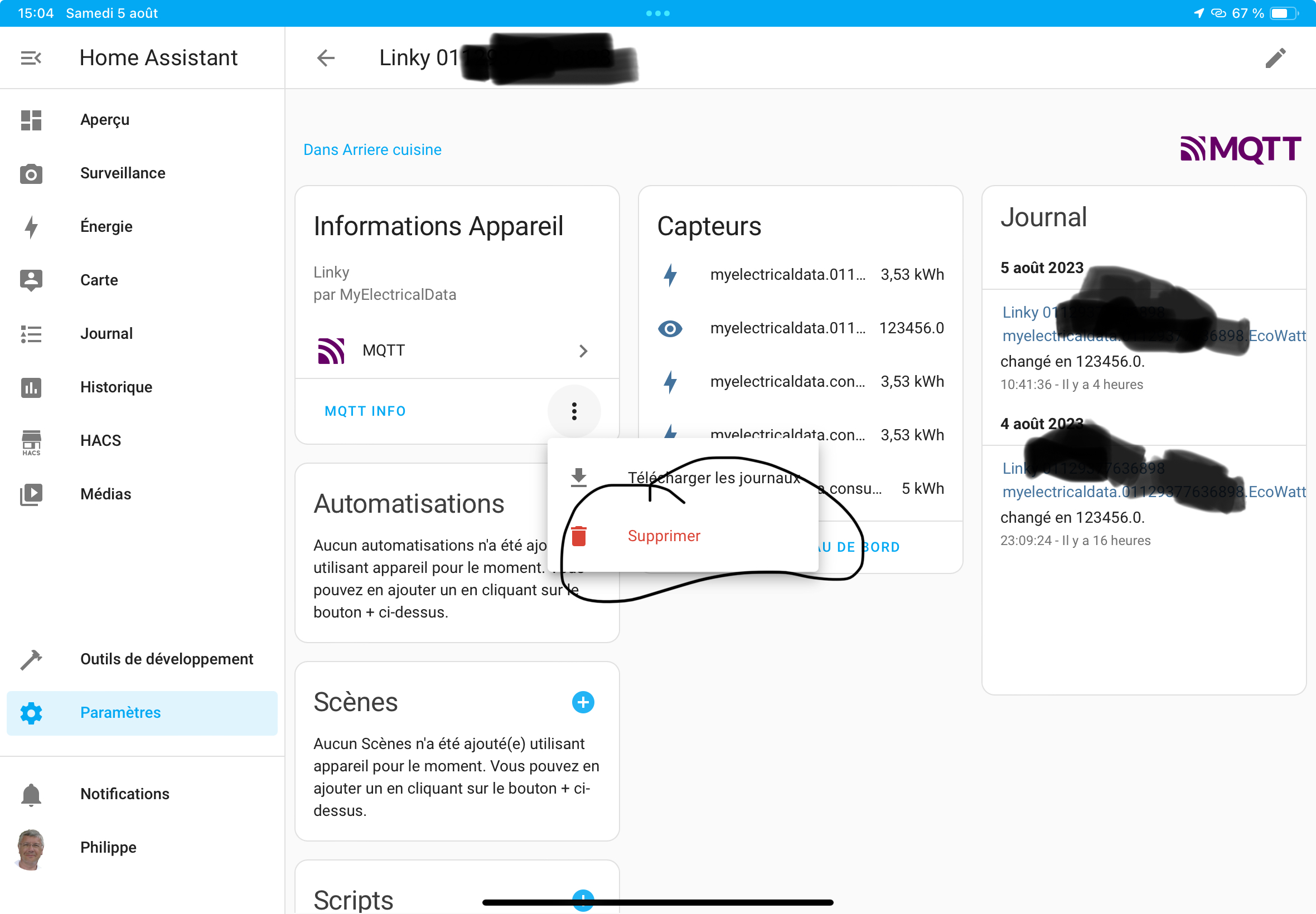 Tu supprimes l’appareil linky dans tes intégrations MQTT