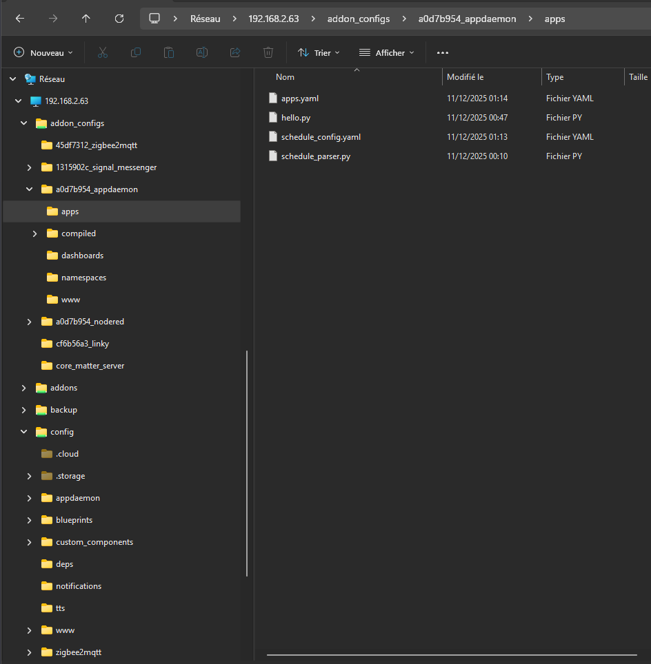 Alors hier soir j’ai tenté l’installation. Mais j’ai pas réussi pour appdaemon, il est installé mais comme il se met dans son propre jeu de répertoires et que je suis sous HAOS je n’ai pas accès à ces répertoires. Alors j’ai activé du Samba et je peux voir les répertoires HAOS via mon file explorer windows, je peux donc modifier les fichiers yaml.