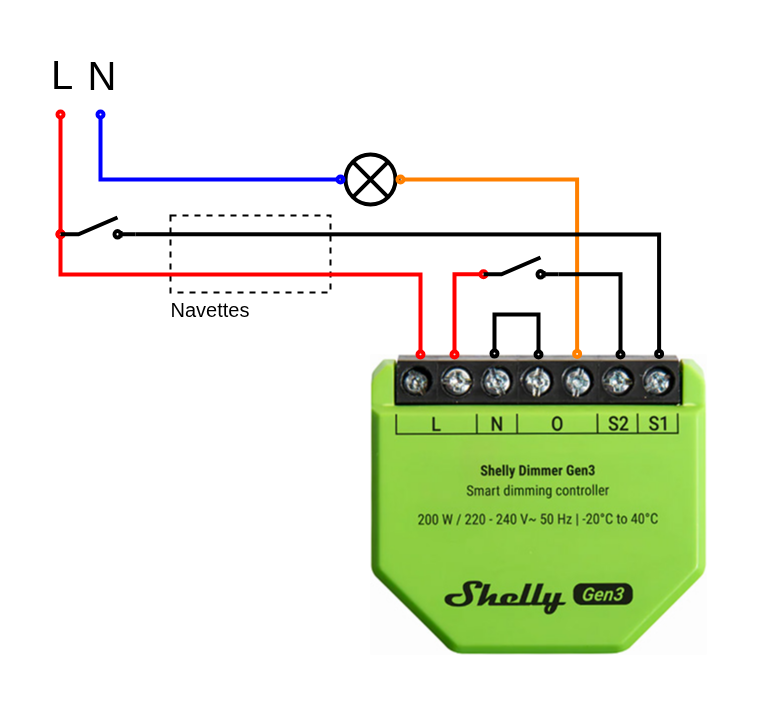 Au cas ou ça peut servir à quelqu’un, je viens d’arriver à faire fonctionner mon Dimmer 3 sur mon va-et-vient en place et sans neutre, avec des boutons monostables (poussoir). Je me suis fait un schema pour ma réflexion. Le « truc » consiste à utiliser une des navettes pour acheminer la phase de l’interro 1 vers l’interro 2 dans lequel j’ai placé le Shelly.