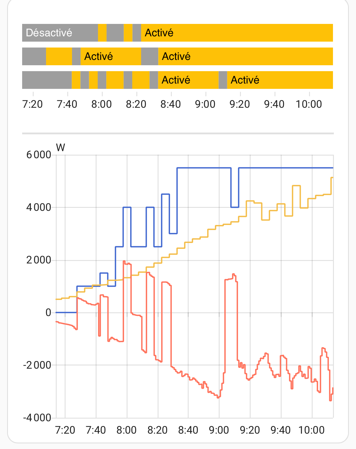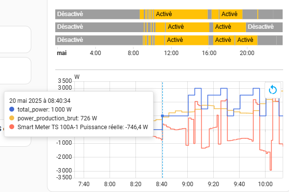 Ok, pourquoi pas vu que le capteur de consommation nette instantanée permet d’avoir les info nécessaire, par contre je ne comprends toujours pas pourquoi les charges s’active (sauf si ce sont les coûts des énergies qui impact) avant même d’avoir la puissance W correspondante en négatif (surplus)