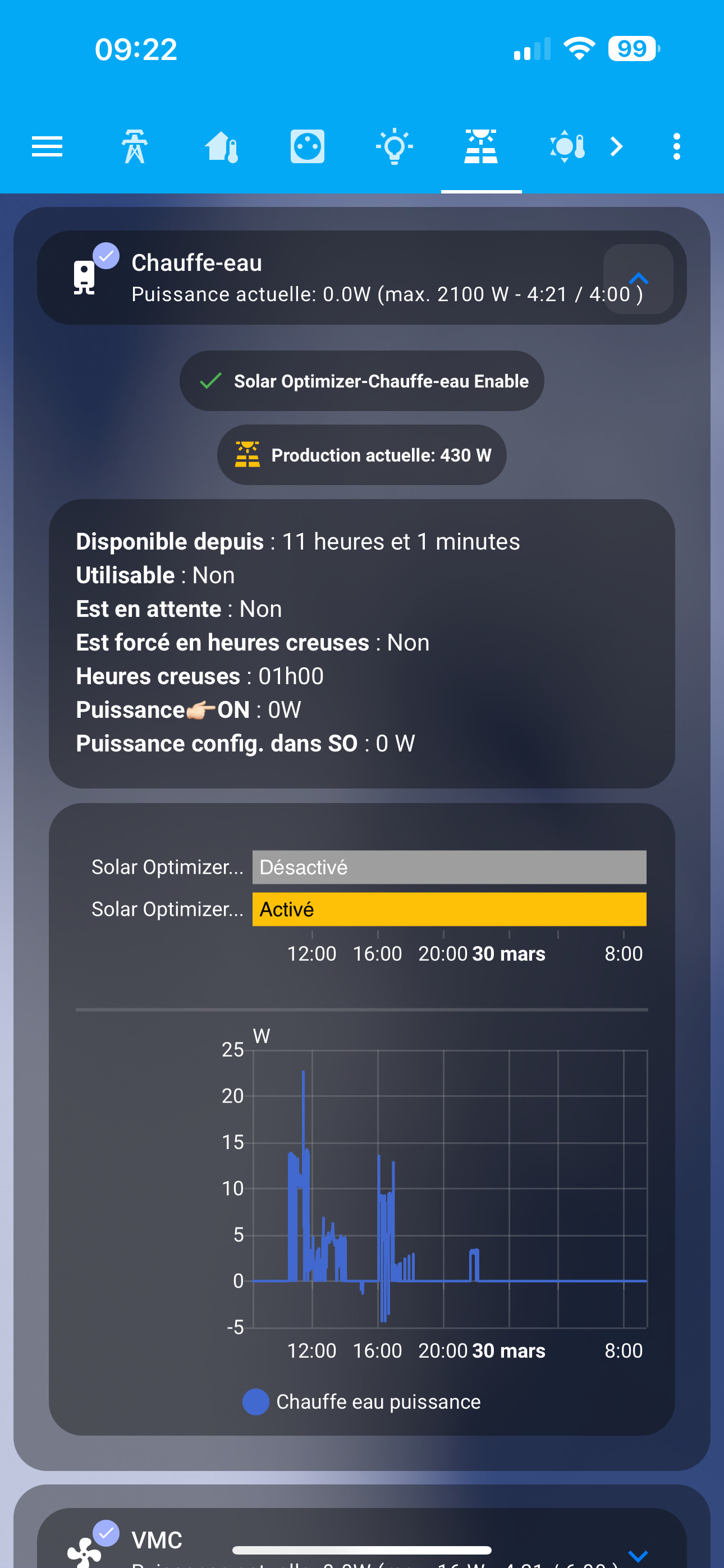 Regarde, chaque remise à zéro du compteur (5h00) le décompte se fait sur l’appareil comme s’il était en marche par solar optimizer, alors que non. Ça me fait pareil sur ma vmc. Il me semble que c’est depuis que j’ai rajouté le sensor charge décharge de ma batterie.