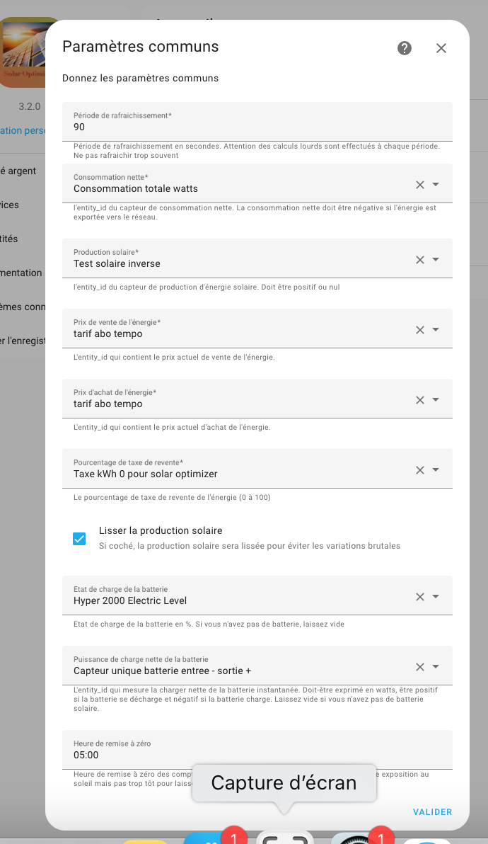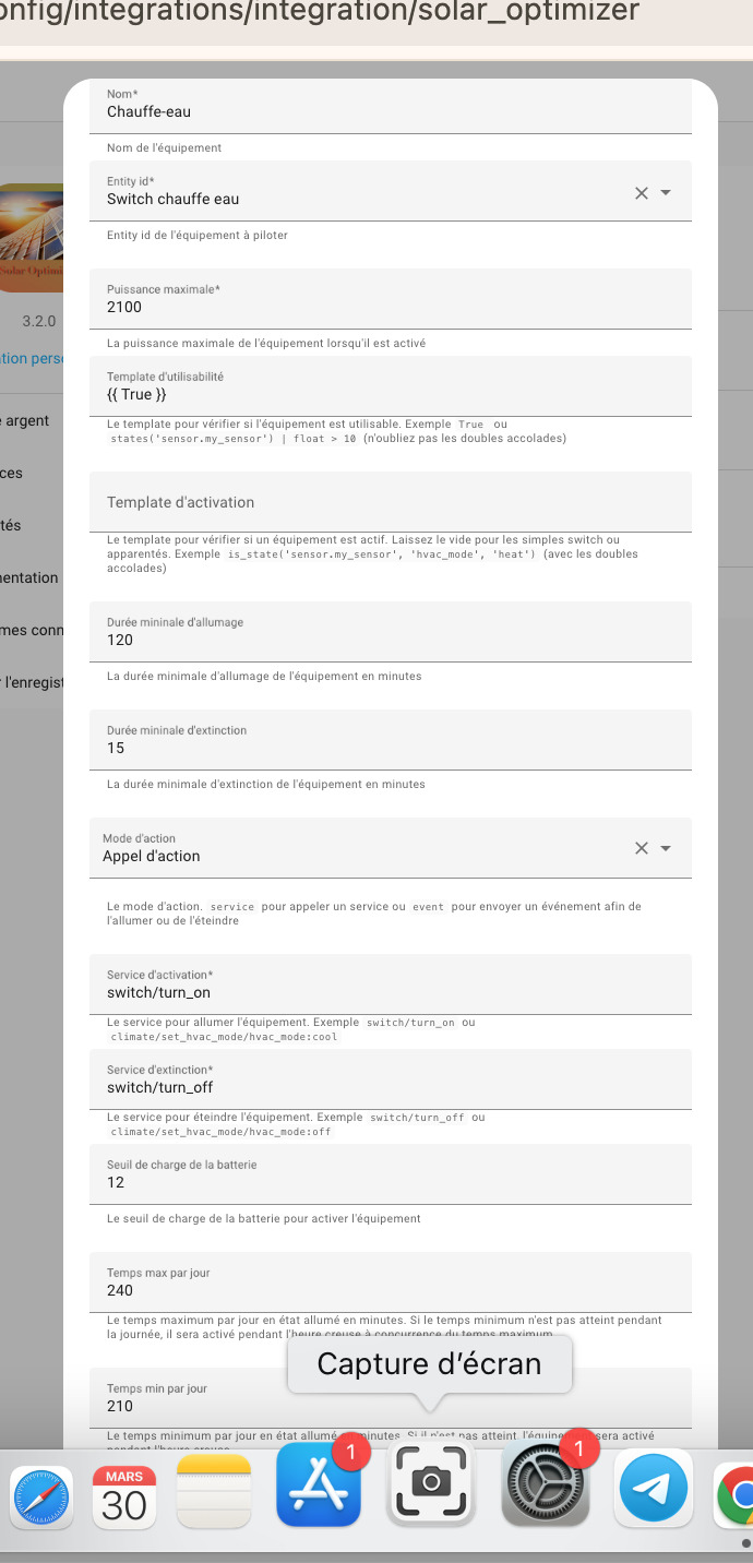 Edit 16h34: Bon, le bug a visiblement disparu, mais je persiste, ce n’etait pas normal, quelque chose a provoqué le blocage du ontimetoday vu comme ON. J’ai reset avec le service action. @Jean-Marc_Collin , j’ai une question: faut-il obligatoirement redémarrer HA si on change quelque chose dans la config du solar optimizer ou d’un de ses equipements ? par exemple, au moment ou je rajouterai l’état de la batterie (%) et le sensor de valeurs charge/décharge, faudra-t-il redémarrer ou non ? car visiblement quand on fait une de ces actions, SO indique le message comme validé et pris en compte, sans redémarrarer. Me suis-je fait comprendre ?