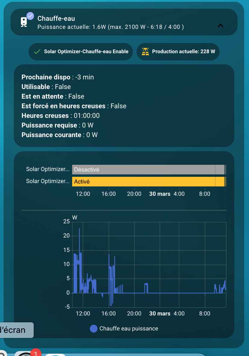 Pour ta réponse, ces valeurs ça correspond à la carte que tu a faite que j’ai un peu renommée, mais en soit ces infos je les trouve pas pertinentes en plus. Normalement, quand le switch solar allume l’equipement, la puissance on et la puissance config dans SO montrent 2100w (la puissance que j’ai renseigné pour mon chauffe eau), mais c’est tout.