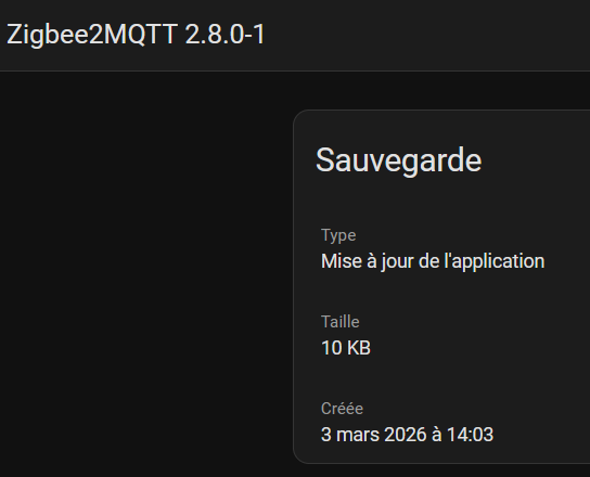 Pour la maj Z2M en théorie c’est toi qui la fait, c’est toi qui la sauve, après si tu as tout laissé en automatique, un de ces quatre tu diras, « tiens plus rien fonctionne et je sais pas d’où ça vient »