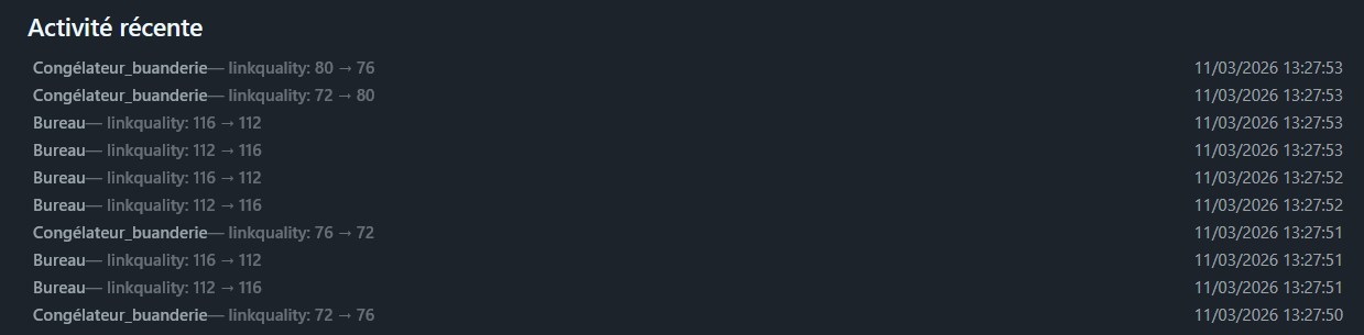 Pour le reste rien ne dit que c’est à cause de la maj, ça peut-être tout et n’importe quoi, un escabeau en métal ( ou tout autre élément perturbateur en métal ou en électronique )« dans » le réseau peut introduire des soucis de réseau zigbee, regarde ce qui se passe dans les logs, donne nous une idée de ton réseau ( la carte ? ) même si c’est indicatif…