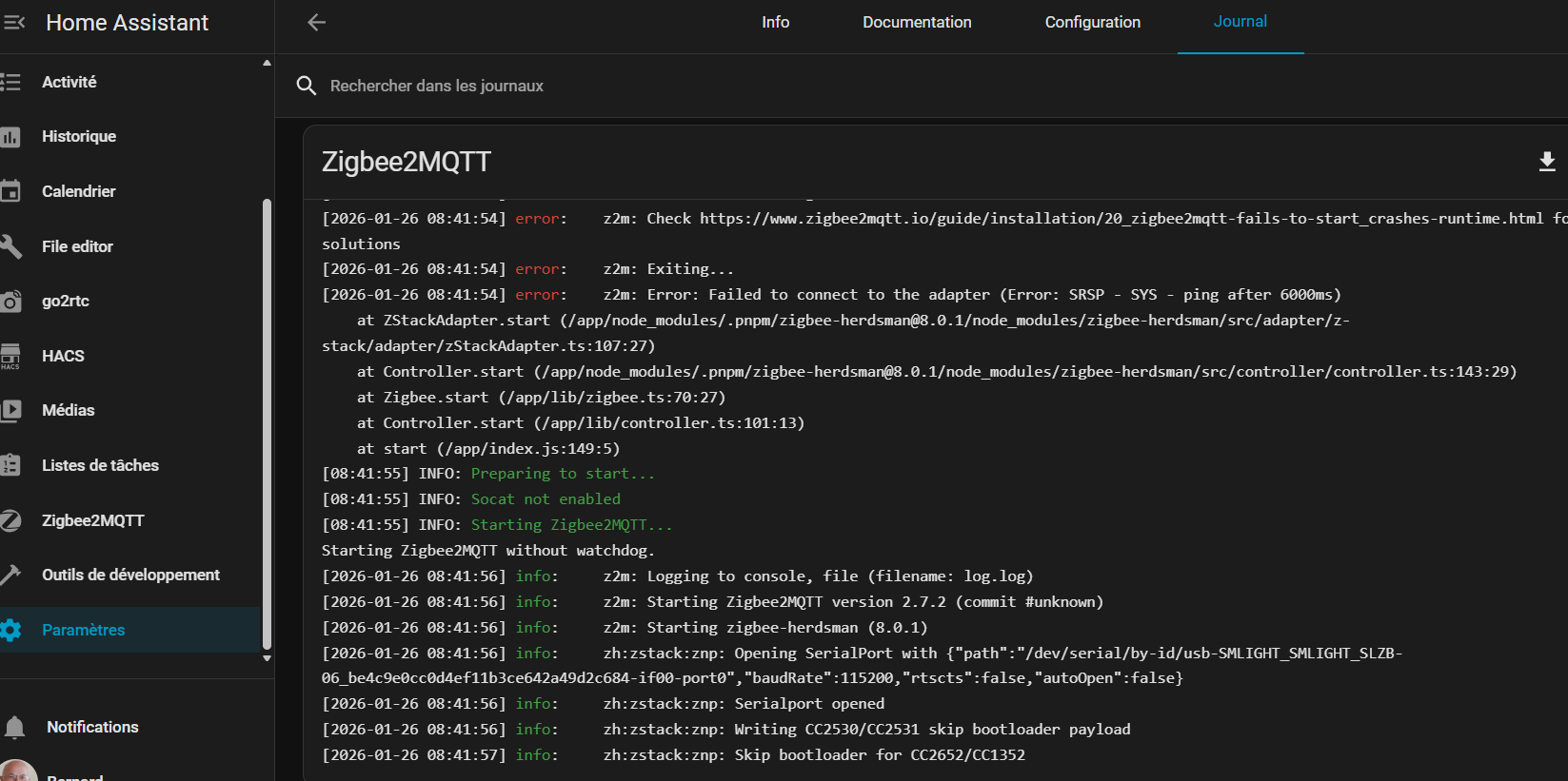 [2026-01-23 18:18:44] error: z2m: Error while starting zigbee-herdsman