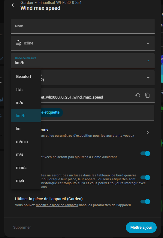 Quand tu cliques sur ton entité, une fenêtre s’ouvre avec les infos détaillées et l’historique. Si tu cliques sur la roue dentée en haut à droite, tu peux changer les unités.