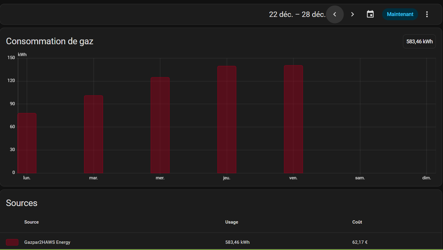 J’ai fini par trouvé pour mon problème de sensor sur Gazpar. Il faut activer le sensor en sql dans le fichier configuration.yaml sinon pas de capteur. J’ai quand même un écart entre la valeur affichée dans le dashboard energy où j’ai par exemple 128,73 pour le 29/12 (dernière valeur dispo) et il me sort 112,19 dans ma Google Sheet et c’est pourtant bien les kWh. Je vais continuer de creuser pour voir d’où vient l’écart.