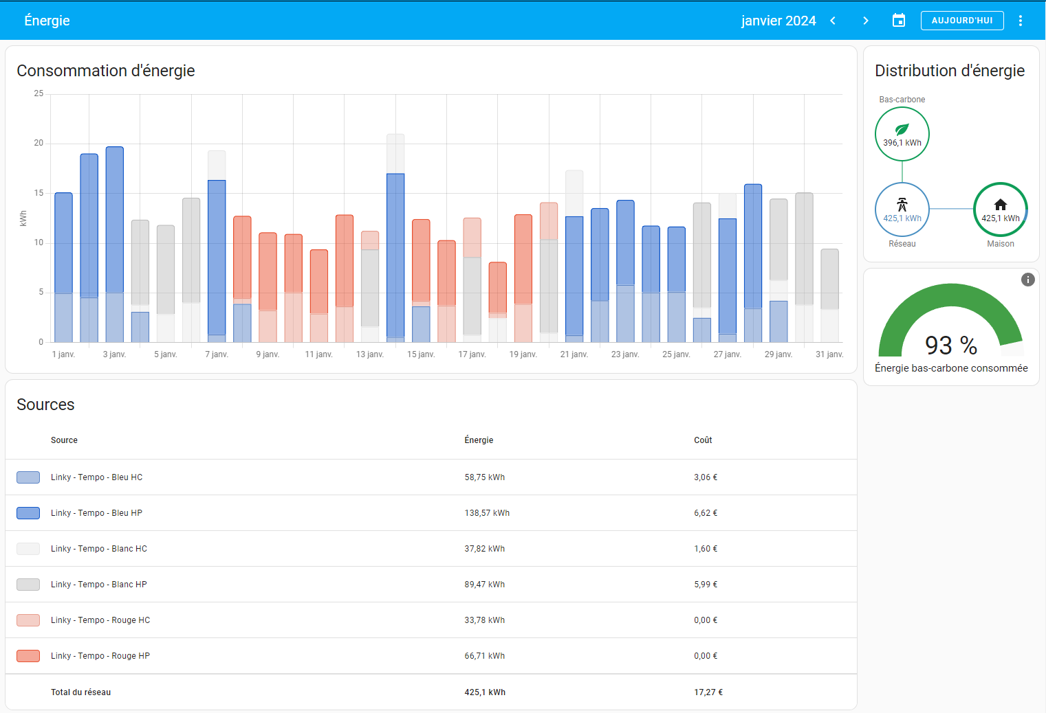 J’ai réussi à intégrer la consommation de mon abonnement EDF TEMPO dans l’onglet Energie de HA avec le module complémentaire Linky et un token api.