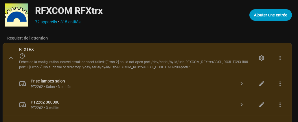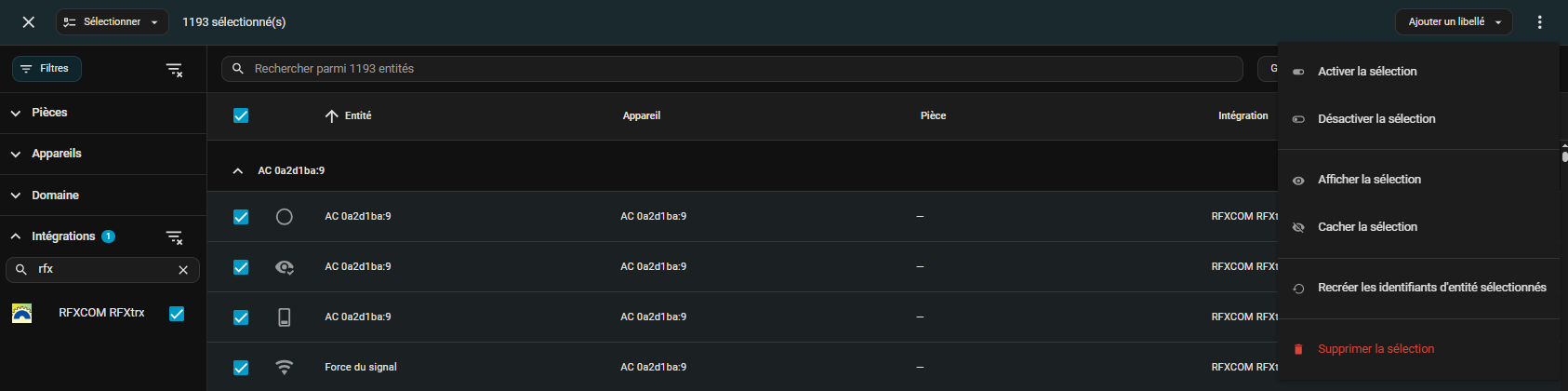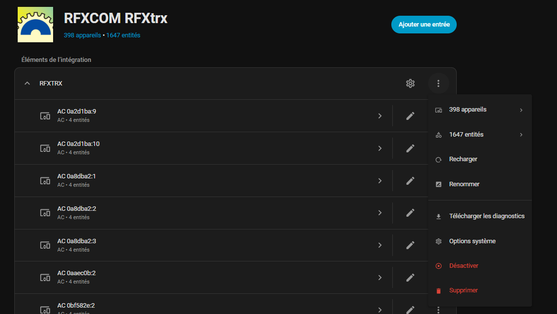 N’en ayant plus l’utilité j’ai revendu mon RFXCOM. Je souhaite maintenant faire le ménage dans mon HA en supprimant l’intégration et les très nombreux modules RF enregistrés (l’appareil ayant naturellement scanné tout le lotissement) :