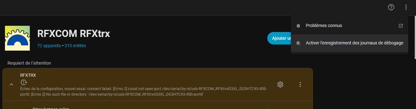 Hop je vais dans Paramètres > Appareils et services. je repère RFXCOM RFXtrx dans la liste, je clique sur l’intégration et en haut à droite de la fenêtre, je clique sur les trois points pour sélectionner supprimer… mais non, pas de menu « supprimer ». J’ai chercher à droite à gauche mais je n’ai pas trouvé.